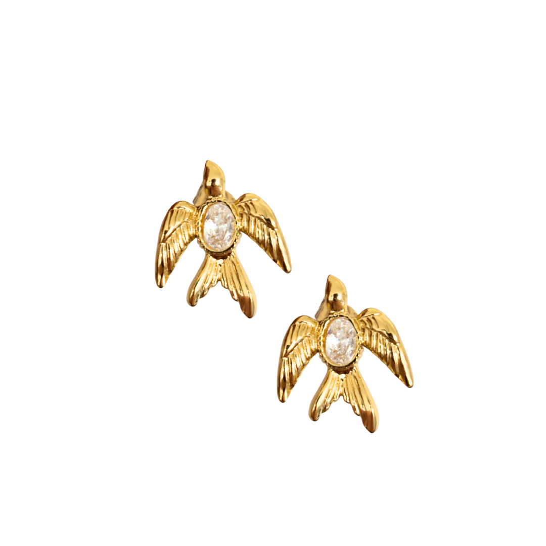 Estos aros en forma de ave simbolizan libertad, protección y nuevos comienzos. Su diseño detallado en acero Dorado se combina con un cristal central que aporta luz y brillo sutil, perfectos para usar todos los días o elevar un look especial.